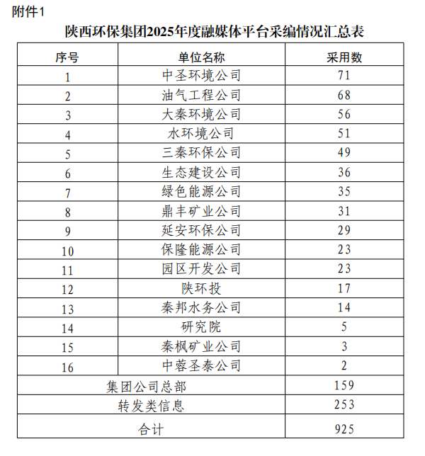 陕西环保集团2025年度融媒体平台稿件采用及2025年四季度优秀稿件评选情况通报